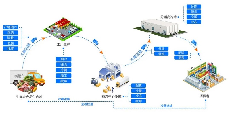 冷鏈是指某些食品原料、經過加工的食品或半成品、特殊的生物制品和藥品在從收購、加工、貯藏、運輸、分銷到零售和使用的過程中,各個環節始終處于產品所必需的特定低溫環境下,以減少損耗、防止污染和變質,從而保證產品安全、生物安全或藥品安全的特殊供應鏈系統。