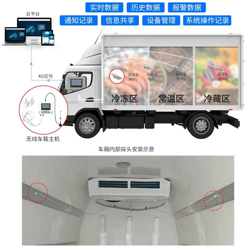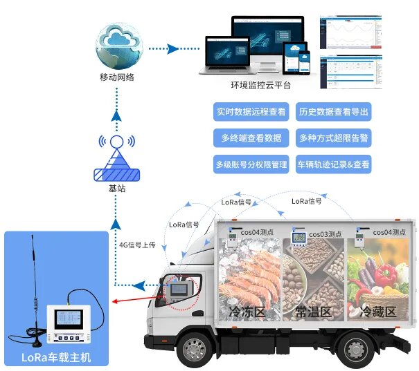 測點與主機之間采用LoRa無線的方式進行通訊(主機和測點的通信距離遠,可用于4.2米~14米長冷藏車、單溫~四溫區冷藏車),使用時只需將主機安裝在駕駛室中,無線測點(1~4臺)通過磁吸/吊繩的方式安裝在車廂的任意多個點位進行監測即可,主機可以將接收的數據以4G的方式上傳至環境監控云平臺,完美解決監測麻煩,布線困難的問題。