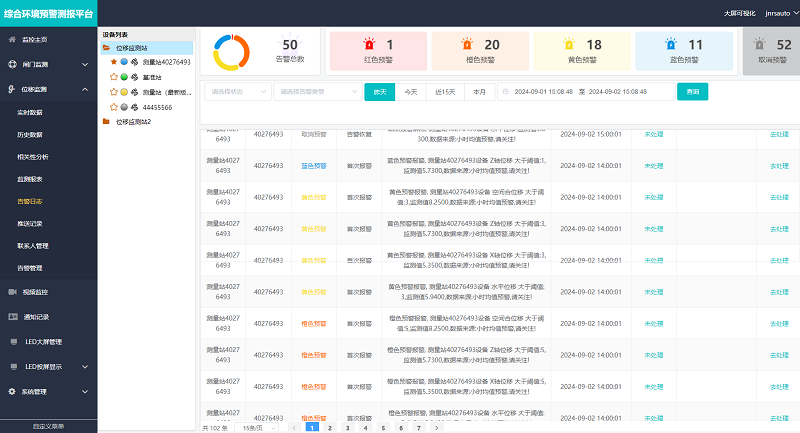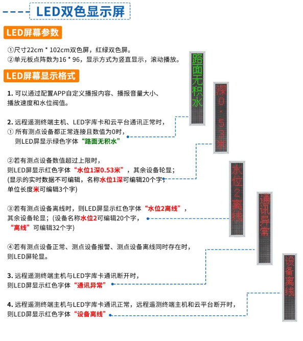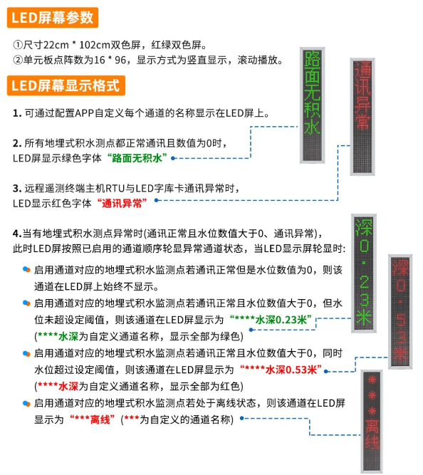 其中,積水監測站中一個LED顯示屏可輪顯多個測點的數據,當出現通訊異常、數據超限等情況,LED顯示屏中的內容及顏色也會發生變化。