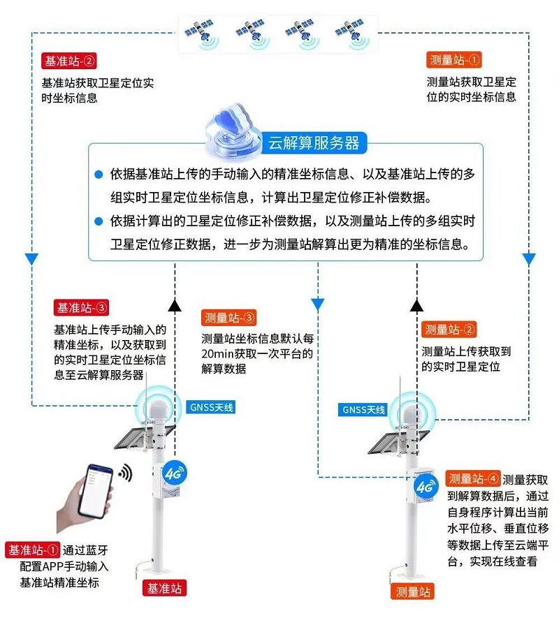 公路邊坡GNSS位移監測站采用“1+N”組網模式(1個基準站+N個測量站)突破傳統監測設備距離限制,支持長距離公路、跨區域橋梁的同步監測。