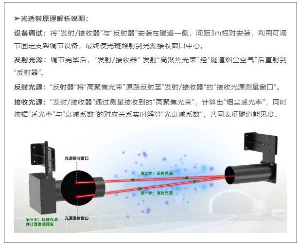 COVI隧道能見度檢測儀集成了先進的自動補償功能,采用獨特的調制光信號技術,基于透射原理,運用往返雙光路,以3m安裝間距計算,將檢測光程擴大至6m,通過讓光線在回路中進行兩次反向傳播,使“檢測光程”變為了“安裝距離"的兩倍,在有限的空間范圍內,增加了光透射的檢測距離,極大的提高了能見度測量的穩定性和可靠性。