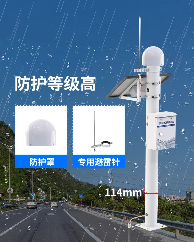 公路邊坡GNSS位移監測站防護等級高,通體采用金屬材質,表面涂有特殊涂層,搭配耐腐蝕的GNSS天線保護罩,能夠在暴雨、沙塵等極端條件下連續工作,持續輸出監測數據;立桿支架(直徑114mm)符合《地質災害專群結合監測預警技術指南(試行) 》標準,用戶可放心使用;加入專用避雷針,有效保護設備安全。
