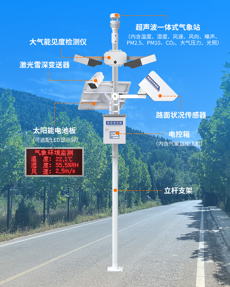 山東仁科公路交通氣象站主要由 各類氣象傳感器、大氣能見度檢測儀、路面狀況傳感器、激光雪深變送器、電控箱、立桿支架、供電系統和顯示屏組成。通過對氣象要素的監測、上傳,提升公路交通氣象基礎監測能力,幫助工作人員排查公路濃霧(團霧)、道路結冰、強降水、大風等災害隱患點。