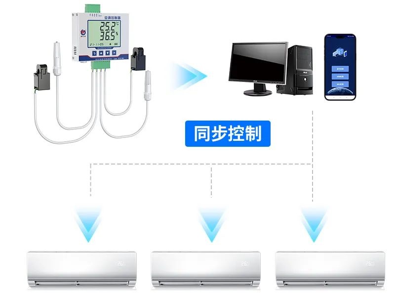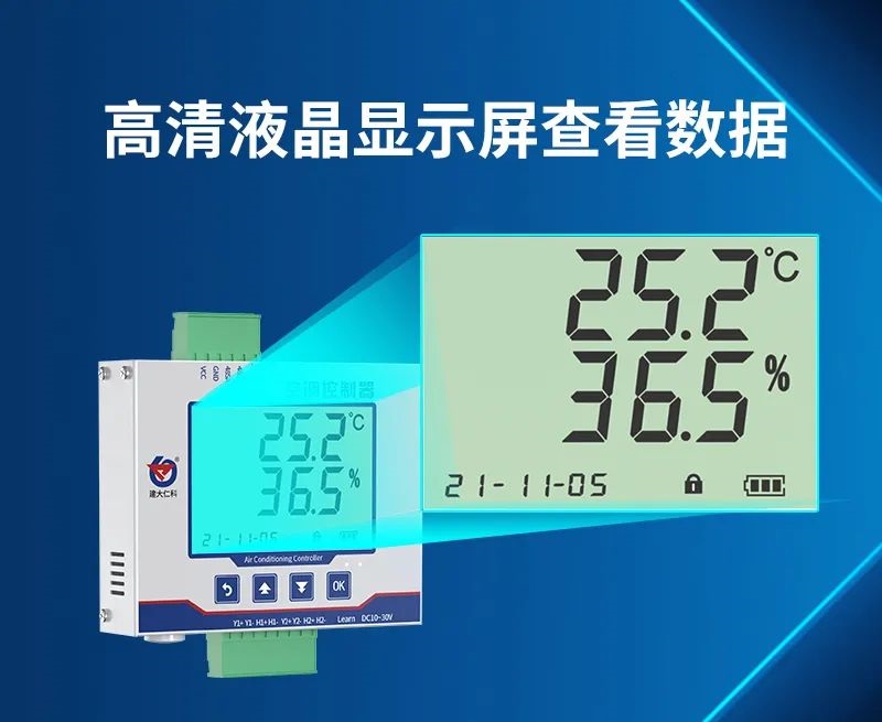 壁掛式空調控制器內置高精度溫濕度傳感器,采用工業級測量芯片,配備高清液晶顯示屏,可實時顯示當前環境數據,解決了傳統空調控制器無法獲取實際環境參數的痛點,實現“所見即所控”的精準調節;同時支持遠程數據采集,解決了大型場所需要人工巡檢記錄環境數據的低效問題,避免了傳統空調依賴設定溫度而非實際溫度導致的能源浪費問題。
