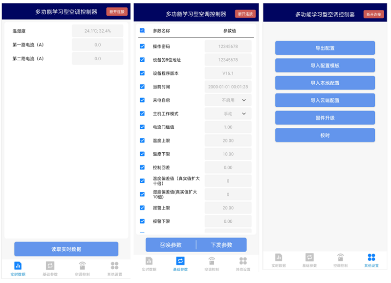 壁掛型空調控制器內置藍牙芯片,可以通過電腦軟件及手機 APP 兩種方式配置,解決了有線配置的束縛,頁面干凈整潔,功能操作簡單易上手。
