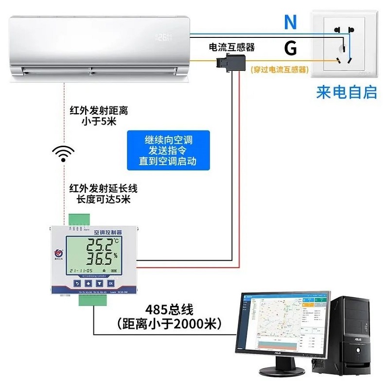 來電自啟功能:設備實時檢測空調供電狀態,當檢測到斷電恢復時,設備會自動向空調發送開機指令,確保空調第一時間恢復正常工作狀態。