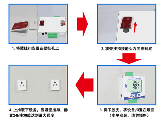 壁掛口安裝:將壁掛口安裝在設備壁掛孔上并推到底,揭下膠皮將設備扣置在墻面,取下設備確保壁掛口粘牢后,再次裝上設備即可投入使用。