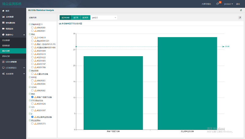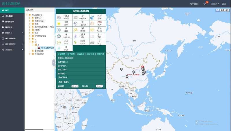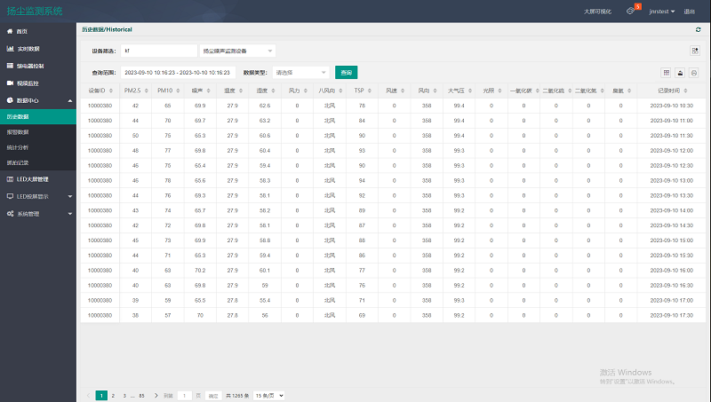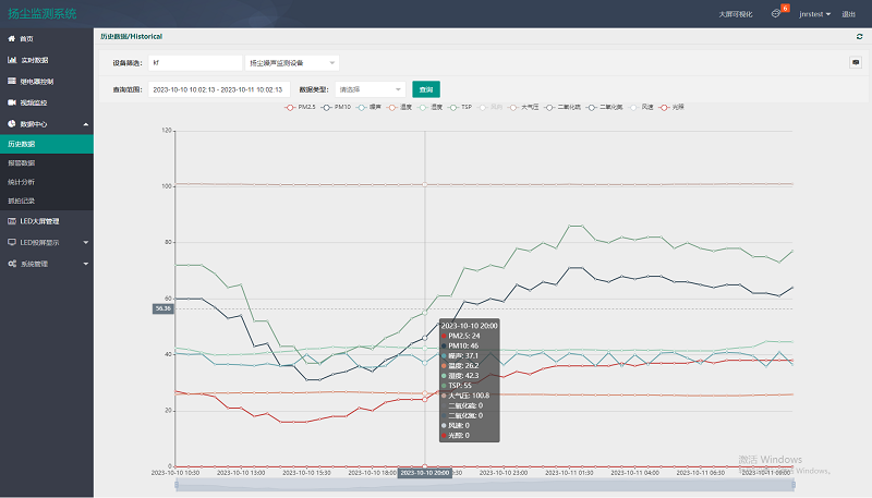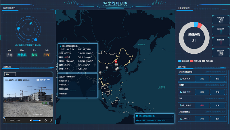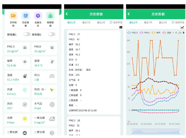 用戶可以通過PC端/揚塵APP登錄揚塵云平臺,同時查看溫度、濕度、噪聲、光照、PM10、PM2.5、TSP、風速、風向、大氣壓力等環境因子實時信息;并支持查看/導出/打印任意時間段內的歷史數據;擁有分區域和項目管理、多賬號登錄等功能,同時具備設備可視化與大屏可視化設計界面,方便工作人員監控,快速總結環境問題所在。