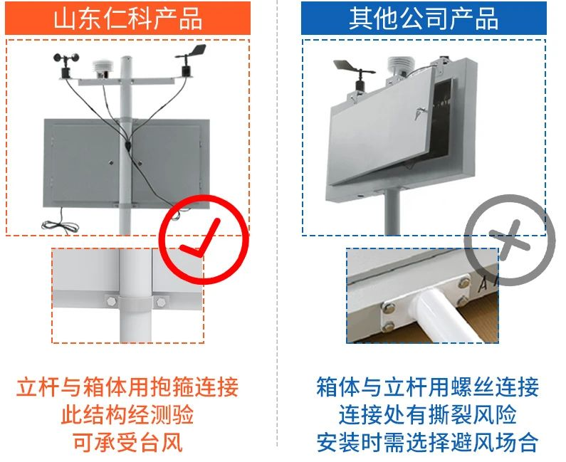 ① 揚塵檢測儀的設計引進了工業級模塊化理念,立桿采用2節法蘭連接設計,通過高強度螺栓固定;傳感器采用防水對插線連接,且線纜帶有獨立標識;有效實現了運輸時分解降本,安裝時快速拼接的雙重效益。立桿高度也完全符合環評采集要求不低于2.8米的標準。