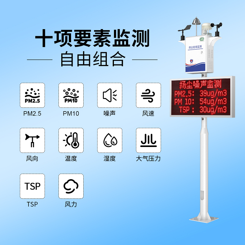 在工地污染治理中,揚塵濃度并非孤立存在,其產生、擴散與氣象條件密切相關:溫度、濕度會改變顆粒物吸附性,風速風向直接影響污染擴散范圍,大氣壓力則與監測設備的測量精度相關聯。