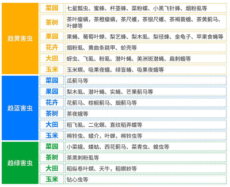 在長期的進化過程中,昆蟲形成了對色彩的趨性(即"色覺")。這類昆蟲多在白天活動,而市面上常見的害蟲誘捕設備主要在夜間工作、白天待機,因此對這些害蟲的誘捕效果微乎其微。