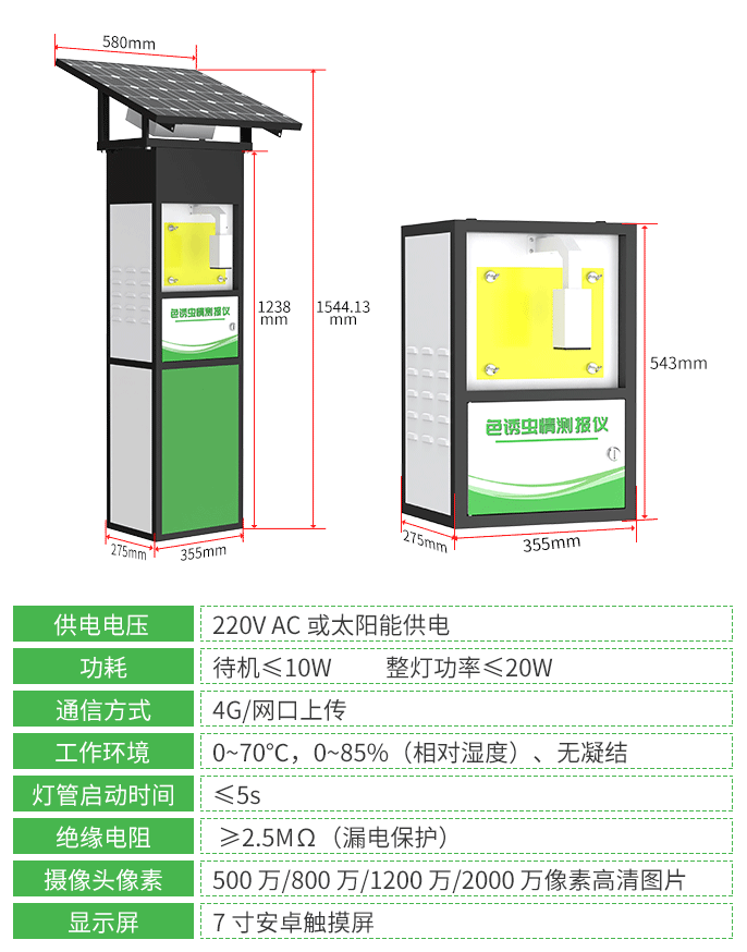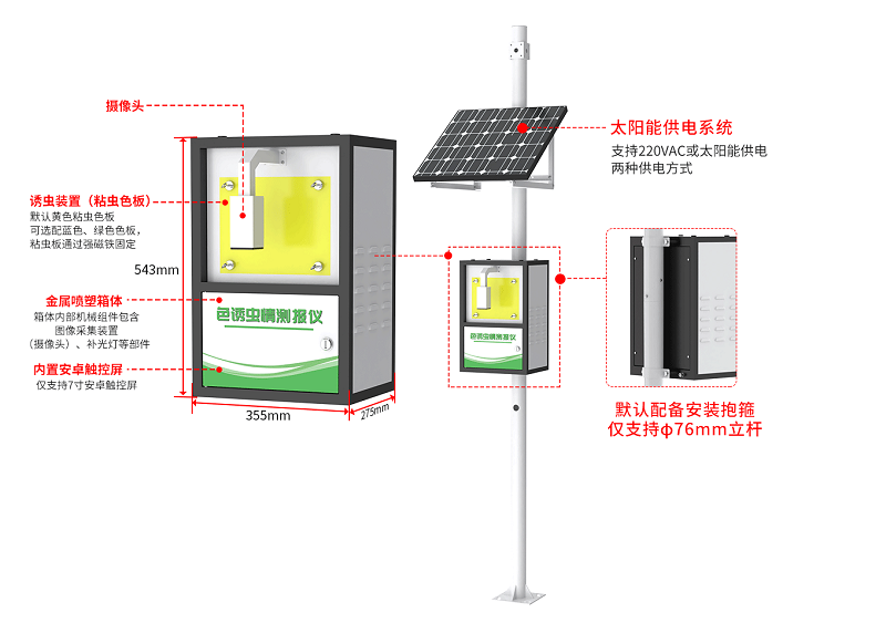 色誘蟲情測報儀主要由“金屬噴塑箱體、安卓主控系統、高清攝像頭、誘蟲裝置(黃/監/綠粘蟲色板)、色板固定裝置、安裝底座(選配)、太陽能供電系統(選配)”等部件組成。