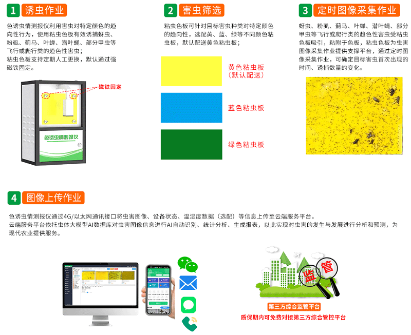 色誘蟲情測報儀采用可定期更換的黃、藍、綠三色粘蟲板,專門誘捕具有趨色性的飛行或爬行類害蟲。該設備基于溫控、時控及平臺聯網控制技術,結合機械組件與高清攝像頭,可在無人值守狀態下自動完成害蟲誘捕滅殺和定時圖像采集等系統作業。采集數據實時上傳至【農業四情測報平臺】后,依托平臺的【蟲體大模型AI數據庫】,對蟲害圖像進行【AI自動識別、統計分析和報表生成】,從而實現對蟲害發生發展態勢的精準預測。該設備兼具蟲害標本采集和蟲情分析預測雙重功能,為現代農業提供智能化蟲害監測解決方案。