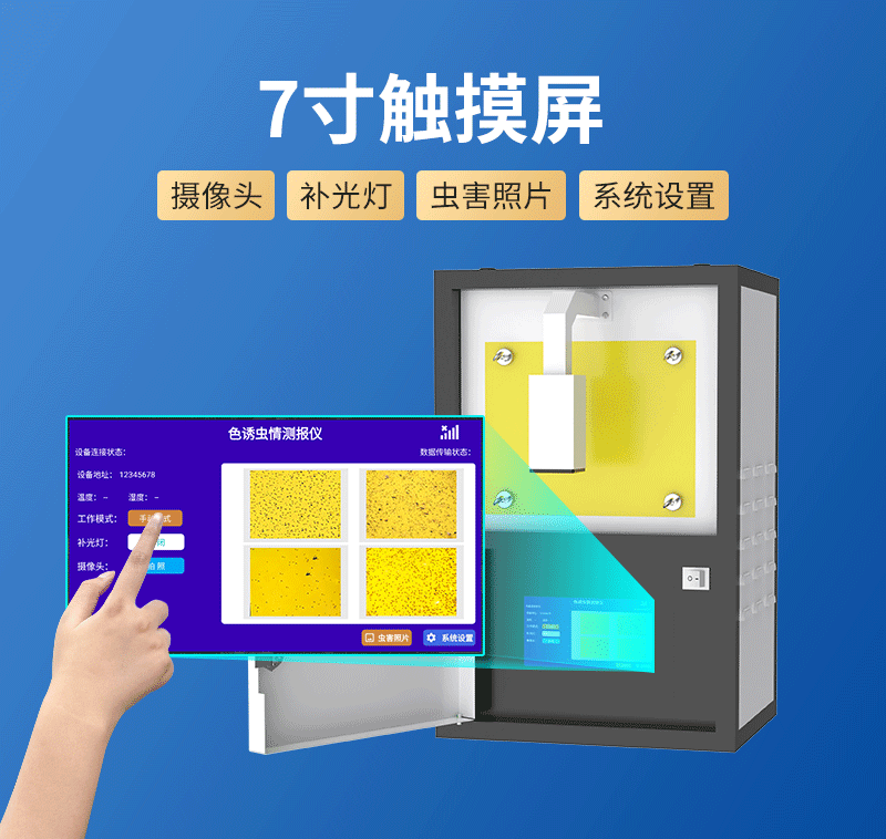 現場控制:色誘蟲情測報儀配備7寸觸摸屏,觸摸屏可實時顯示關鍵信息,如工作模式、通訊狀態、蟲害照片等,極大簡化了設備的監控流程,用戶還可直接通過觸摸屏開關設備及設置相關參數等。