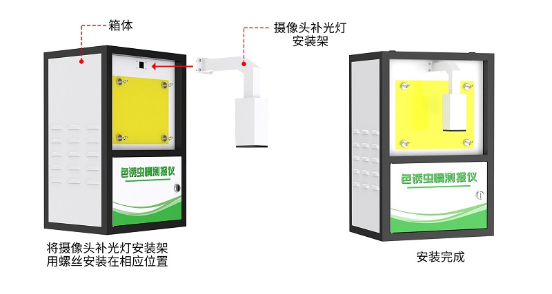 用戶只需將色誘蟲情測報儀箱體從包裝箱內取出,對照使用說明書的裝箱單仔細清點,檢查設備附件是否齊全后,將攝像頭補光燈安裝架用螺絲安裝在相應位置即可。