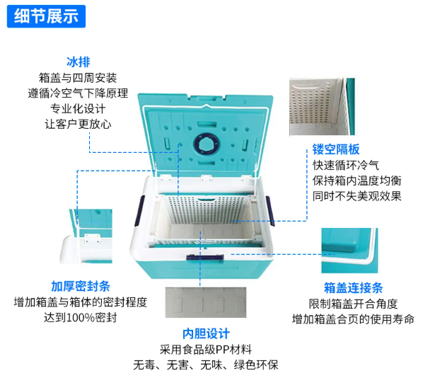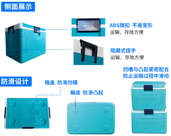 保溫箱箱體 采用三層復合結構工藝,材料選擇上嚴格遵循安全環保標準,確保無毒無害特性,表面光潔度 符合衛生運輸規范。產品兼具高強度結構、持久保溫性能及長效使用壽命等突出特點,完全滿足溫敏物品的嚴苛運輸要求。
