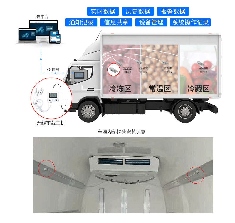 冷藏車溫濕度監測系統(有線)由“4G車載多探頭溫濕度記錄儀+環境監控云平臺”組成。4G車載溫濕度記錄儀的探頭可靈活布置于車廂內的關鍵監測點位,實現運輸空間的多方位環境參數采集。探頭可通過高精度傳感器實時監測所在位置的溫濕度數據,通過有線傳輸方式將數據傳送至駕駛室內的主機設備,滿足不同規格冷藏車的全方位監控需求。主機在接收到數據后,會進一步通過4G網絡將數據上傳至環境監控云平臺,實現數據的遠程存儲、分析與共享,方便用戶隨時隨地查看運輸過程中的溫濕度變化。