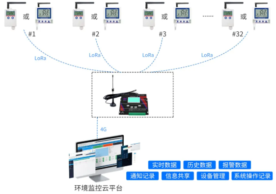 系統通過在冷庫內合理布設多個溫濕度測點,利用LoRa無線通信技術,將數據實時上傳至LORA主機(單個LORA主機可同時連接32個測點),再由主機通過4G網絡將數據傳送至環境監控平臺,實現對庫內環境參數的全面采集與集中管理,這種架構設計具有規模化優勢,確保了大型冷庫實現無死角、全覆蓋的溫濕度監控。