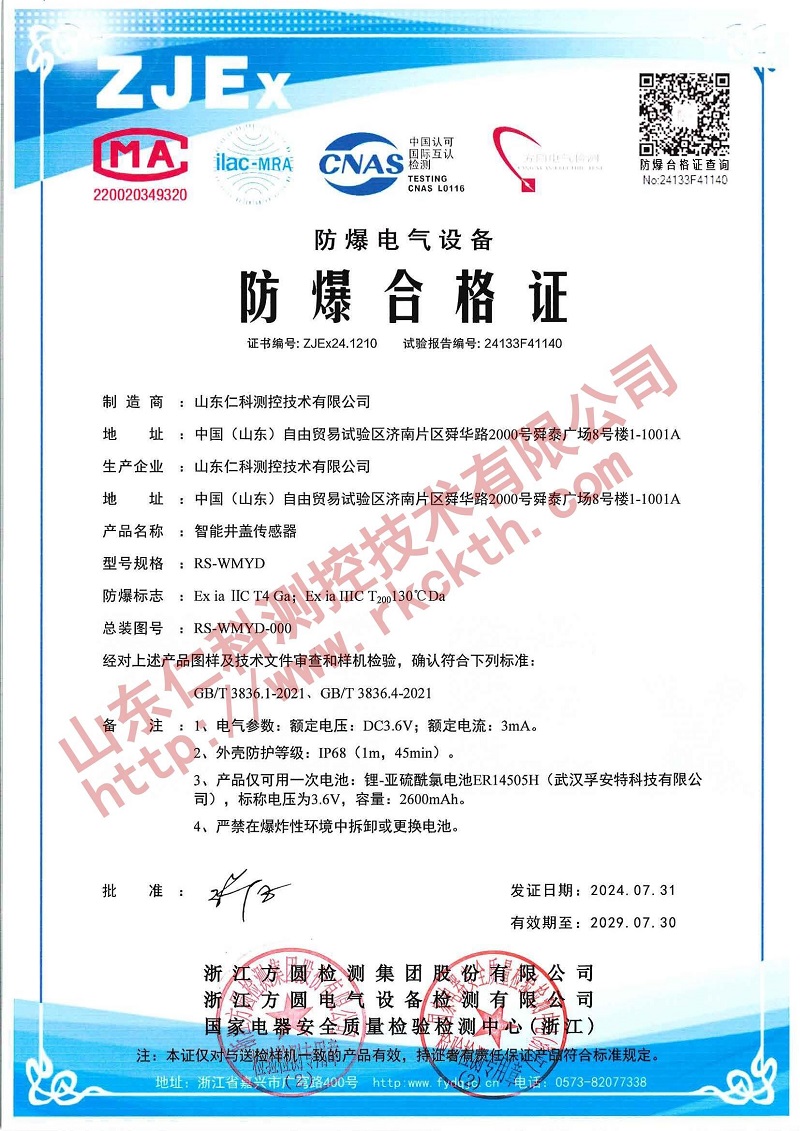 在井下環境中,部分區域因環境復雜且存在安全隱患,可能積聚易燃易爆氣體。因此,設備的防爆能力是應用中的關鍵安全要素。智能井蓋傳感器具有經國家認證的防爆合格證書,其設計、制造及測試全過程均嚴格遵循國家防爆標準規范,不僅確保了設備在惡劣工況下的穩定運行性能,更能顯著降低潛在的安全風險。