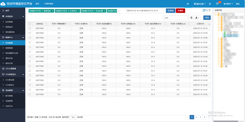 智能井蓋監測系統具備實時監測功能。管理人員可以隨時查看任一井蓋的當前狀態,包括傾角角度、水浸狀況、空高值、液位高度、光照數值、電池電量、信號值等關鍵參數,解決了傳統人工巡檢的滯后性問題,為快速響應提供了數據基礎。
