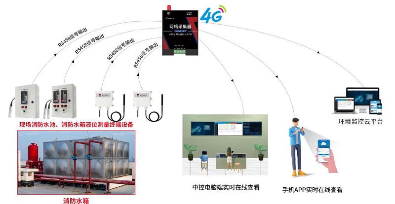 該系統由消防液位顯示器、RS485王字殼單溫度變送器、4G型網絡數據采集器以及綜合環境監控云平臺組成,該系統通過安裝消防液位顯示器(包括液位傳感器以及液位顯示器)對消防水源設備的水位高度進行實時監測,將液位信號轉化為電信號,數據高亮實時顯示,同時傳輸到消防控制室云端平臺,從而實現遠程監控;通過單溫度變送器對消防水源設備的水溫進行實時監測,可以及時發現水溫過高或過低的情況,防止因水溫異常導致滅火效果下降甚至失效,滅火設備損壞等問題。通過實時監測液位高度和水溫,可以全面了解消防水源設備的運行狀態,系統一旦“捕捉”到消防水箱/水池水位超標或者溫度異常的“信號”,就會自動發出蜂鳴報警并將采集到的“RS485信號”通過4G網絡采集器轉換為4G通信的方式上傳至綜合環境監控云平臺,同時以短信、語音、郵箱等形式通知后臺管理人員,提醒管理人員及時采取補水等措施,確保消防水源設備始終保持在良好的工作狀態。最大限度的減少消防安全事故損失和事故造成的負面影響,保障人民群眾的生命財產安全。
