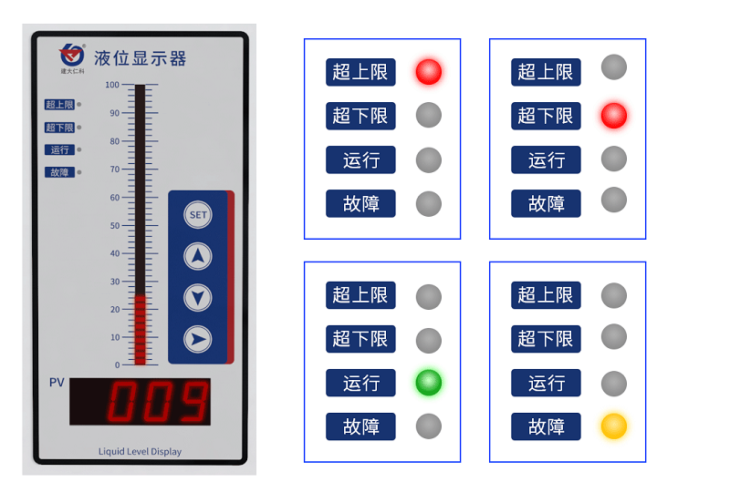 消防液位顯示器也可以實現水位異常時就地報警。設備自帶蜂鳴器報警裝置,且箱體上有低位報警和高位報警指示燈,水位異常時會進行蜂鳴報警且相應指示燈亮起,同時附帶消音開關可以一鍵停止報警聲音,便于現場維護。還帶有一路繼電器輸出接口,當任意通道液位值超限,繼電器均會吸合,常用于擴展聲光報警器,做現場聲光報警使用。消防液位顯示器中帶有顯示面板指示燈:當 水位超上限/超下限、設備運行正常/故障時,相應狀態的指示燈會亮起。