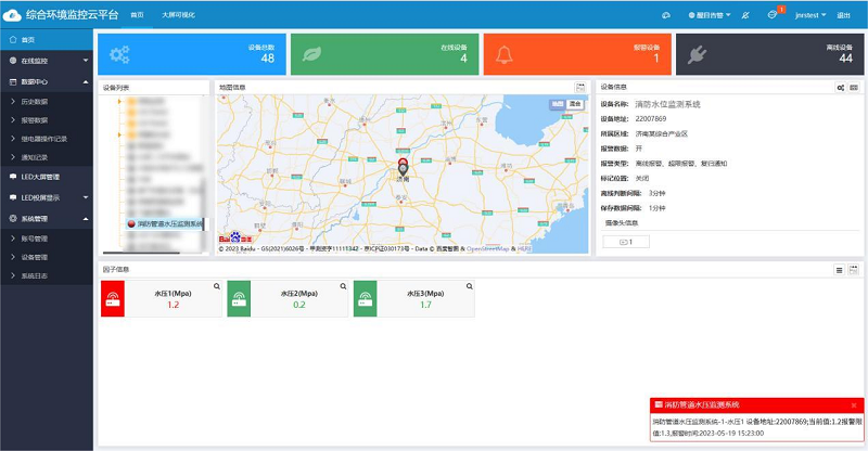 平臺采用專業的數據庫,穩定可靠、易于擴展,支持軟、硬件分層,支持多級用戶管理權限。具備多級別告警方式,支持語音、短信、郵件和現場聲光報警方式。消防管道水壓監測平臺會自動收集數據采集器采集到的數據,通過GPS地圖、列表、圖標、曲線的方式在平臺頁面端顯示,滿足用戶對實時監測信息的多維度、多層面查看數據。