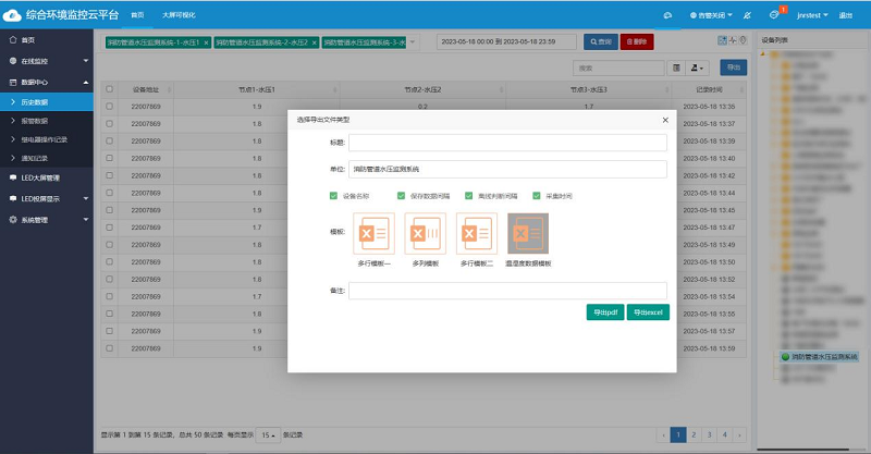 可查詢一個或多個監測點的歷史數據、報警數據,根據需要選擇相應的監測點、時間范圍和數據類型進行查詢。支持PDF、Excel等多種數據格式導出,導出內容標題、使用單位名稱用戶可自定義,同時可導出數據查詢的時間段、查詢數據賬號、保存數據間隔、離線判斷間隔等重要信息。