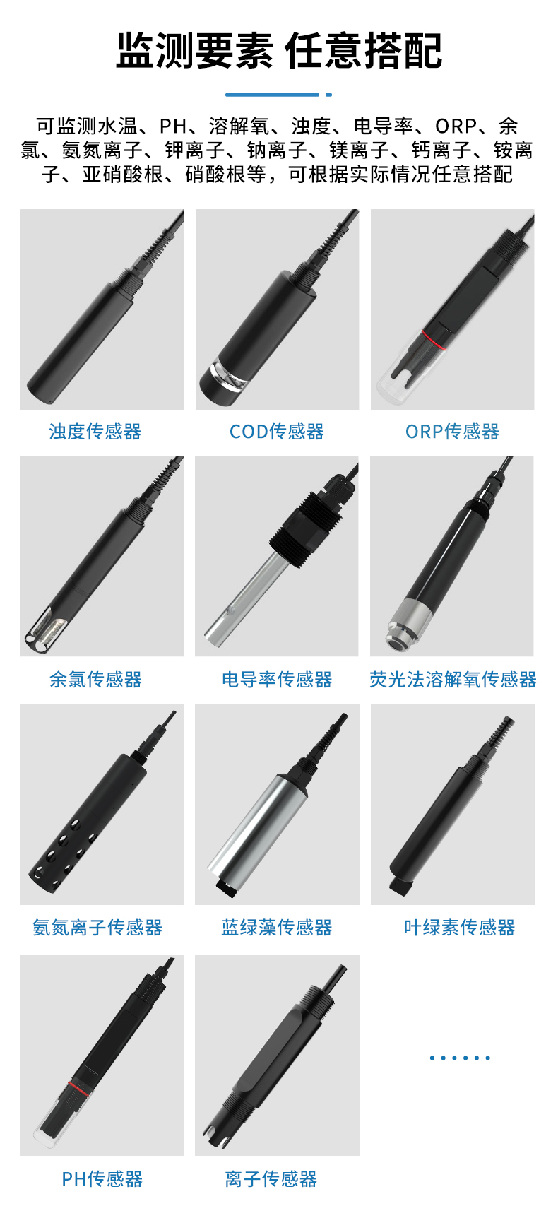 本系統數據采集終端可接入各類(監測)傳感器,流量、PH、氨氮、總磷、電導率、余氯、濁度總氮、COD、水位、溫濕度、溫濕壓、風速風向等,兼容大部分的傳感器。